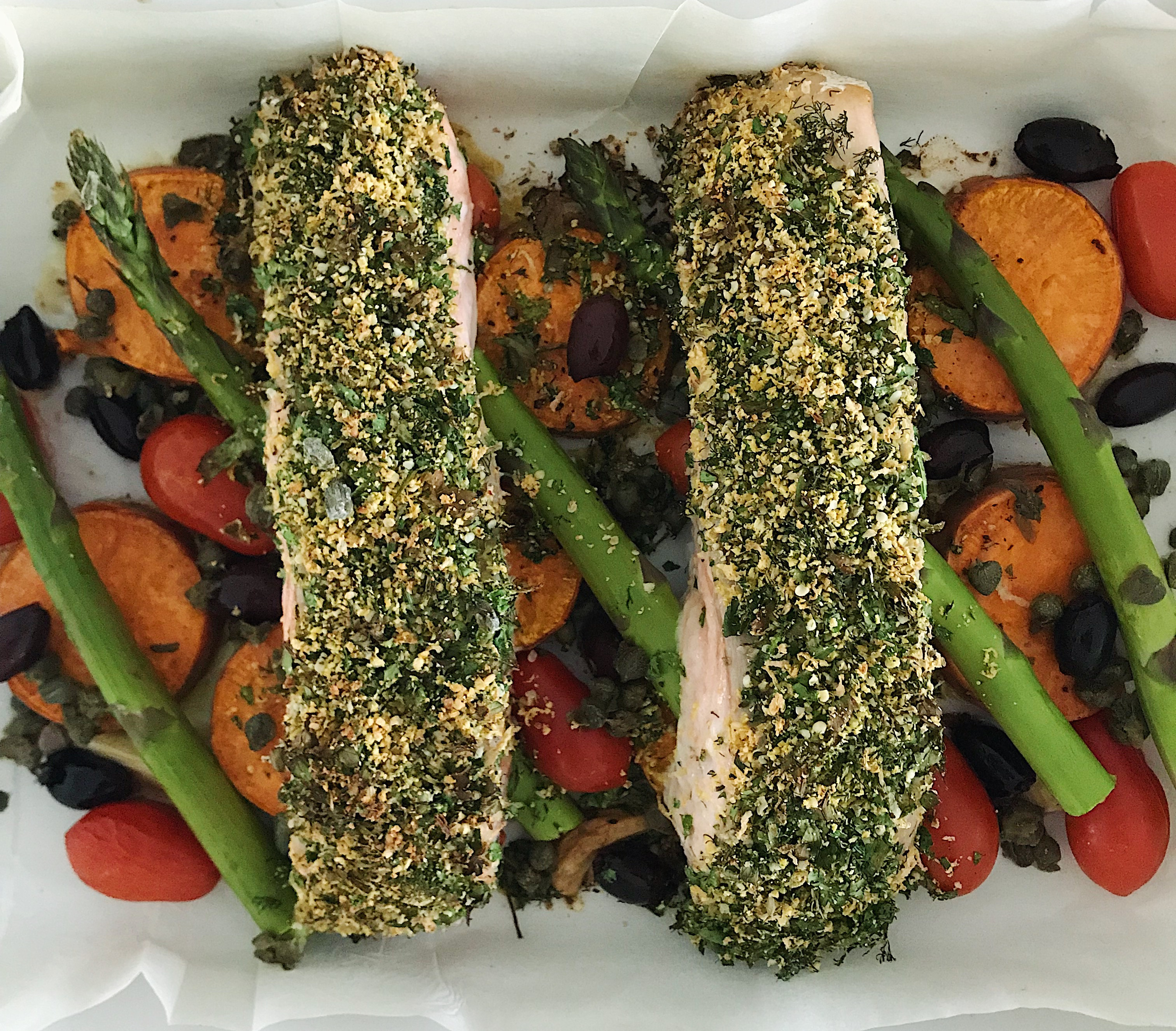 Check on the sweet potato, remove from the oven and scatter on top the asparagus and tomatoes. Then place the salmon pieces nicely on top. Cook for a further 5 minutes.